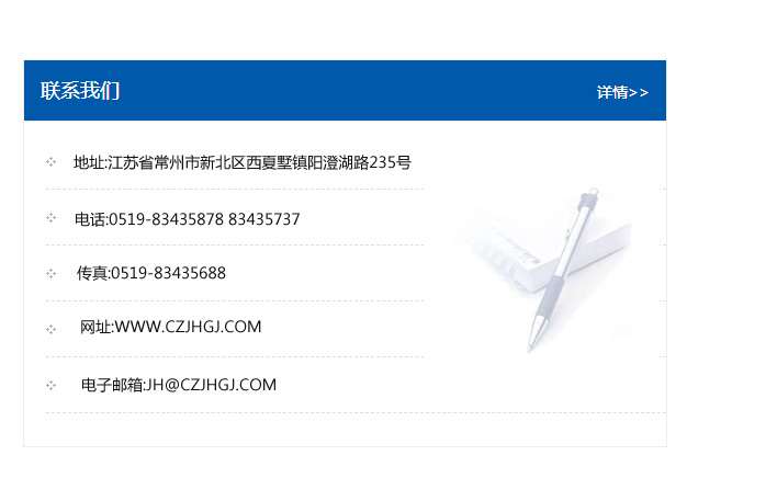 地址:常州市新北區友邦商務大廈1幢16、17層  電話:0519-85101652  傳真:0519-85112595  郵編:213022  網址:www_cz-jiayue_cn.shsanlo.com  郵箱:xiajifengaa@163.com